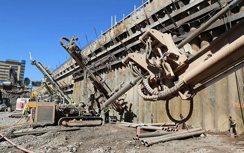 Installation of ground anchors or tiebacks to stabilize retaining structures and deep excavations.