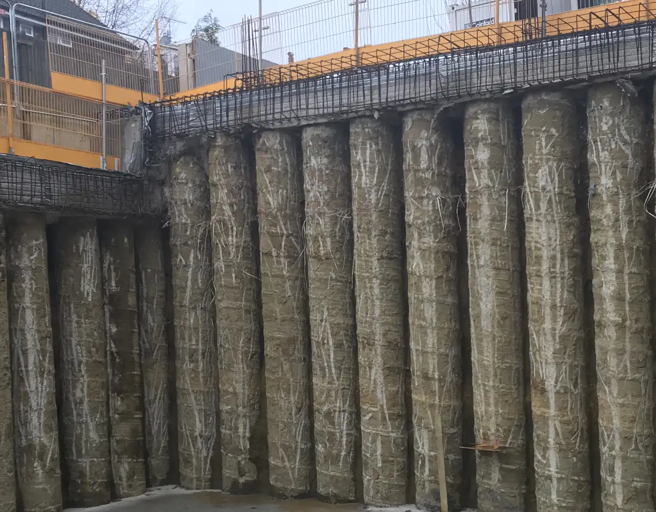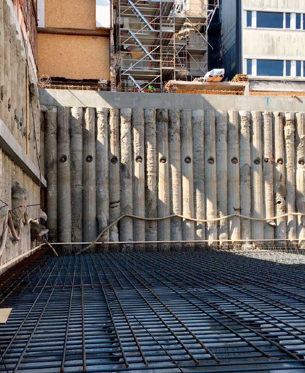 Closely spaced bored piles installed side by side to create retaining walls with controlled groundwater flow.